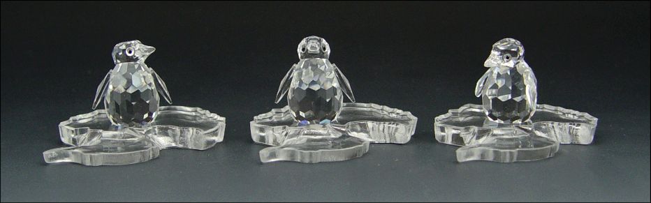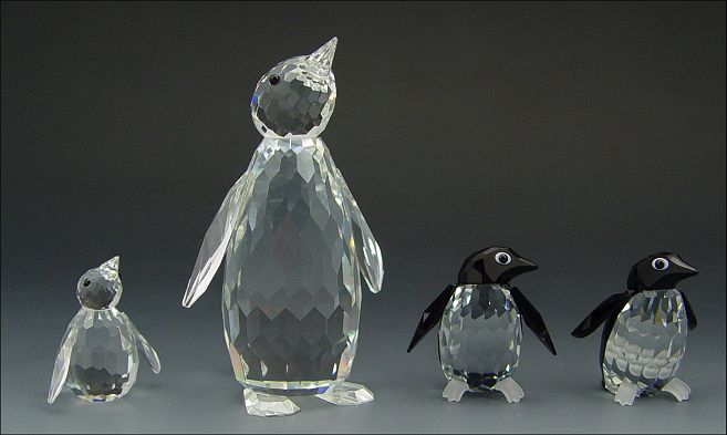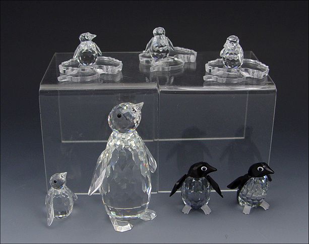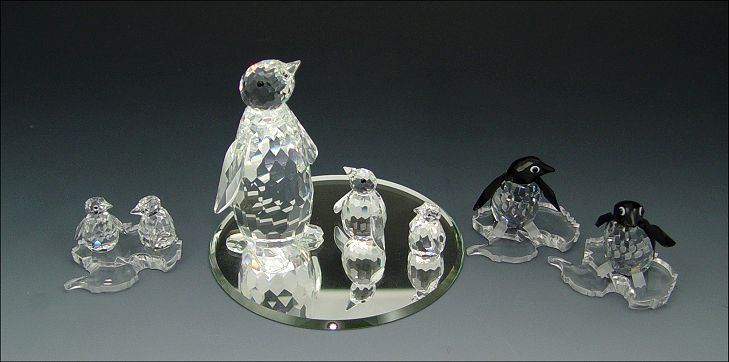 SWAROVSKI CRYSTAL ''KINGDOM OF ICE AND SNOW'': 7 piece, 1984 Large Penguin, retired 1995, 3 3/8''; 1985 Mini Penguin, 1 1/4''; 1995 Sir Penguin, 1 1/2''; 1996 Madame Penguin, retired 1999, 1 1/2''; 1997 Baby Penguins (3), 15/16''. Sold with three plastic Antarctic continents. All have boxes.