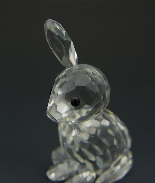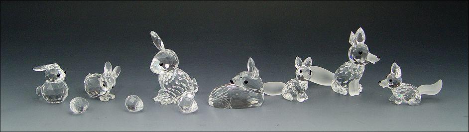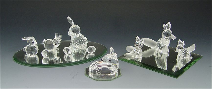SWAROVSKI CRYSTAL 10 PIECE FOXES, DEER, RABBITS & EGGS: 1979 Mini Rabbit, retired 1988, 1''; 1988 Mother Rabbit, 2'', missing ear; 1988 Mini Lying Rabbit, ''In a Summer Meadow'', retired 1995, 1 3/8'', very tiny chip to back of left ear. ''Our Woodland Friends''- 1994 Roe Deer Fawn, retired 1998, 1 5/8''; 1987 Large Fox with Black Nose, retired 1999, 2 3/4''; 1988 Mini Sitting Fox, 2 1/4''; 1988 Mini Running Fox, retired 1996, 1 3/4''. Sold with three faceted eggs (drilled tips for stringing) and the three mirrors shown in picture. All have boxes.