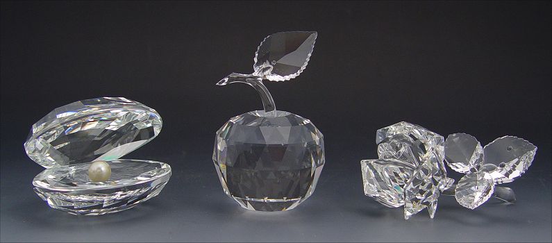 SWAROVSKI CRYSTAL 3 PC LOT: 1988 Open Shell with Pearl, ''South Sea'' series, 2 1/2''; 1991 Apple, 3'', 1 flea bite noted; 1993 Rose, ''Exquisite Accents'' series, 3 1/4''. No boxes, sold as a lot.