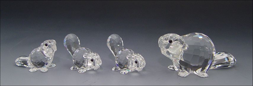 SWAROVSKI CRYSTAL 4 ''ENDANGERED SPECIES'' BEAVERS: 1992 Mother Beaver, retired 1996, 3''; 1992 Sitting Baby Beaver, retired 1999, 1 3/4''; two 1992 Lying Baby Beavers, retired 1995, 1 1/2''. All have boxes.