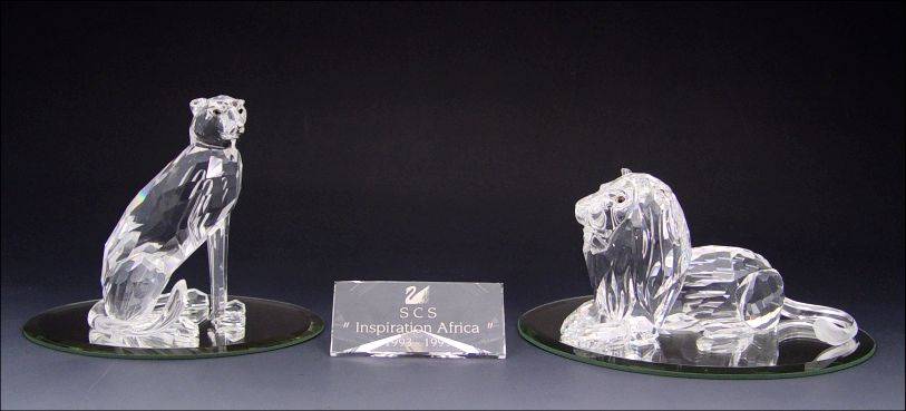 SWAROVSKI CRYSTAL AFRICAN BIG CATS: ''African Wildlife'' 1994 Cheetah, 4'' and ''Inspiration Africa'' 1995 Lion, closed 1995, 5''. Sold with Inspiration Africa plaque and mirrors as shown in image. All have boxes.
