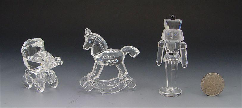 3 SWAROVSKI CRYSTAL FIGURES: ''When We Were Young'' - 1994 Rocking Horse, 2 3/4''; 1996 Baby Carriage, retired 1999, 2 1/8''. ''Exquisite Accents'' - Nutcracker, retired 2003, 3 1/4''. All have boxes.