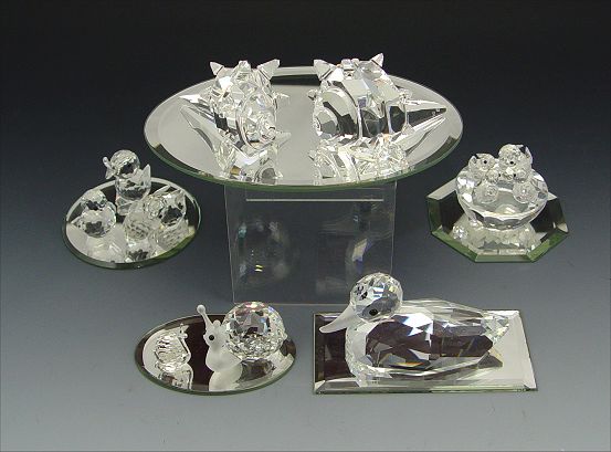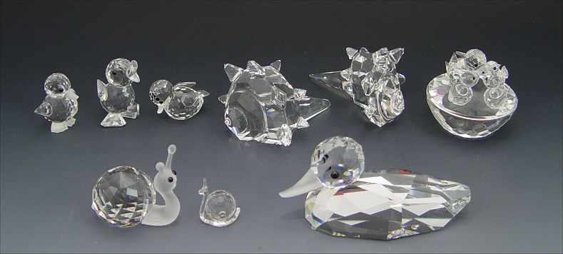 SWAROVSKI CRYSTAL 9 PIECE DUCKS, SHELLS & SNAIL LOT: ''Exquisite Accents'' - 1987 Bird's Nest, retired 1996, 2''. ''South Sea'' - 1991 Two South Sea Shells, retired 1994, 2 3/4''; ''In a Summer Meadow'' - 1986 Snail, retired 1995, 1 1/2''; and a tiny baby snail with a thin clear neck, that might be off a leaf. ''Beauties of the Lake'' - 1983 Mini Drake, 1 5/8''; 1986 Mini Swimming Duck, 1 3/8''; 1986 Mini Standing Duck, 1 1/4''; 1986 Mallard Var 1, retired 1994, 3 1/2''. Some have boxes.