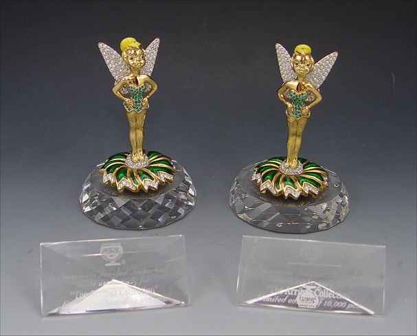 2 SWAROVSKI CRYSTAL ARRIBAS COLLECTION TINKERBELLS: 1998 Exclusive edition of 10,000 world wide, each figure with over 280 pave stones, available only at Arribas Stores in Disney Theme Parks, 3 1/4'', with stands and boxes.