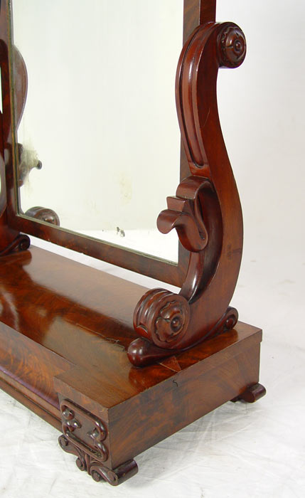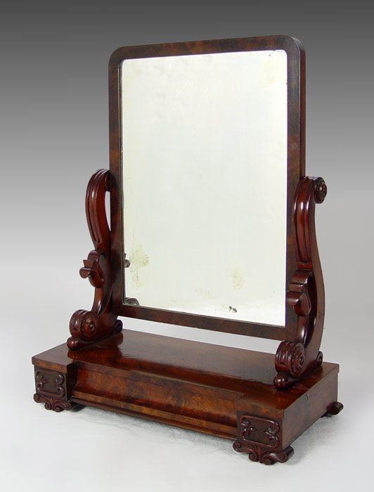 AMERICAN EMPIRE MAHOGANY VANITY MIRROR: Flame mahogany veneer mirror frame supported by shaped dolphin form brackets. Resting on a single drawer base, carved scroll foot. Nice overall condition. Mirror has age blemishes. 33'' h. x 26'' x 12''