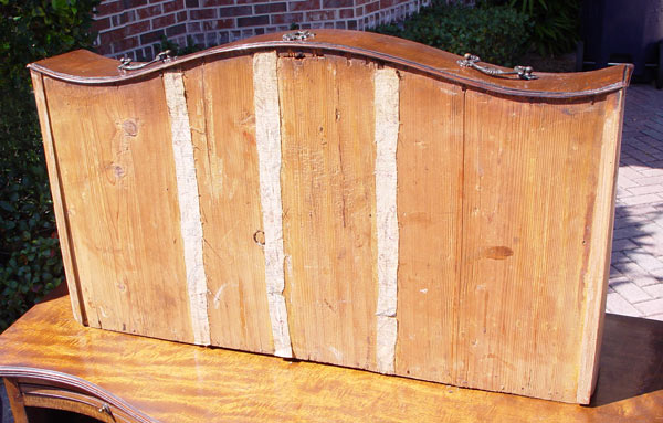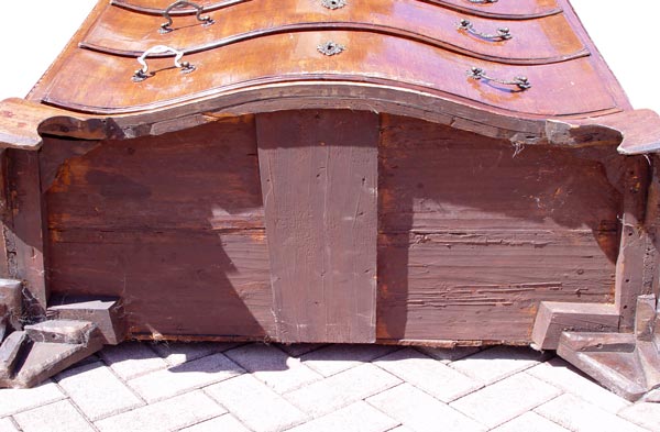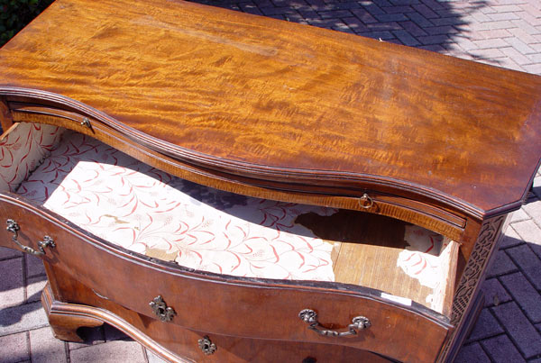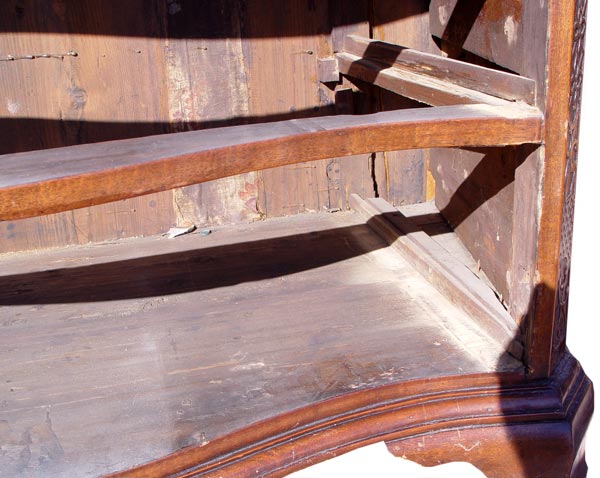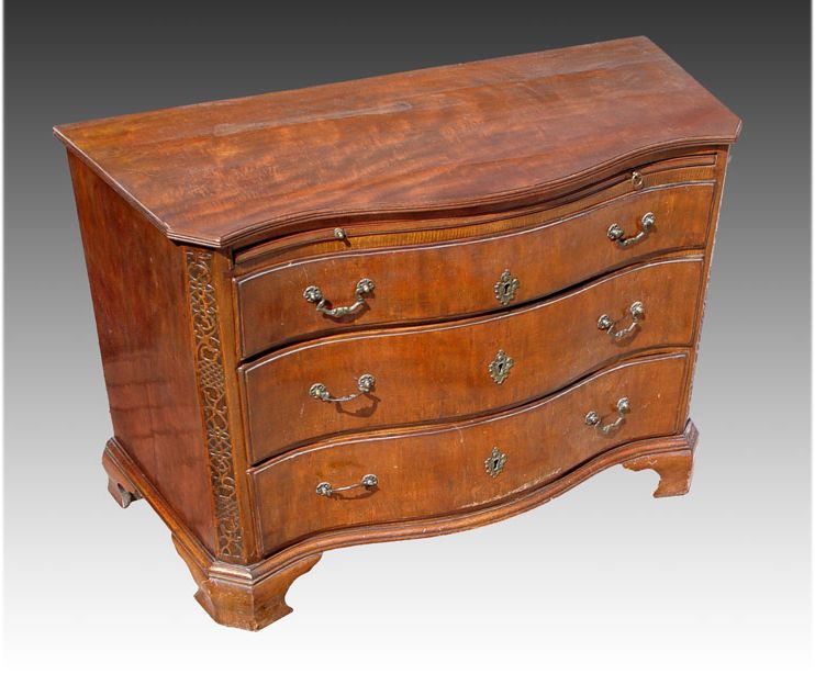 18TH C ITALIAN WALNUT SERPENTINE CHEST: Canted corners with Chippendale style carved details. Cut bracket base. The three drawers still have heavy remnants of paper. Upper slide out serving shelf. Original interior drawer locks, later drawer pulls. One missing pull ring on the serving shelf. Good overall condition. 31'' tall x 47'' wide x 21'' deep.
