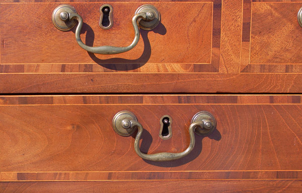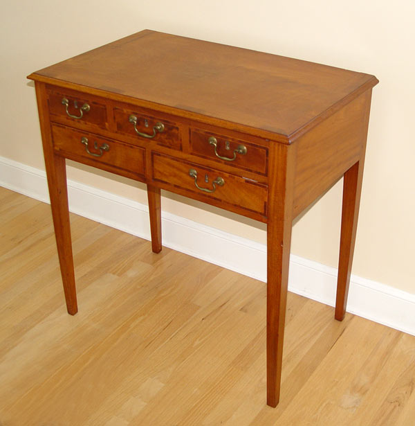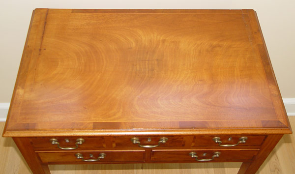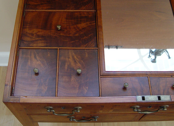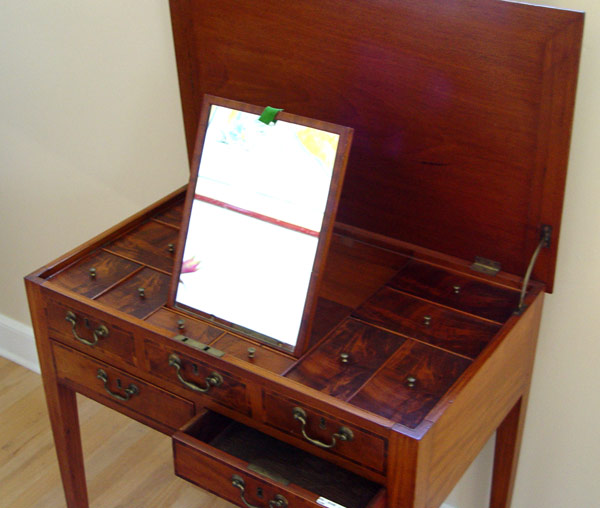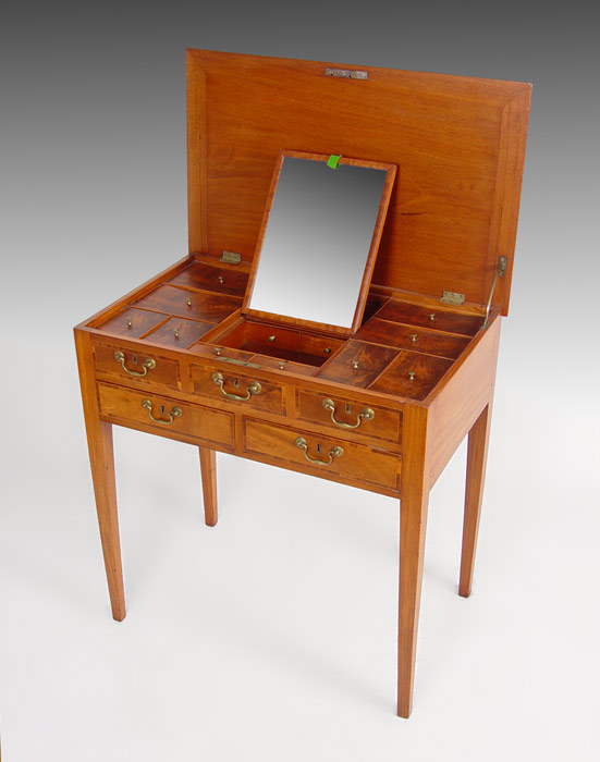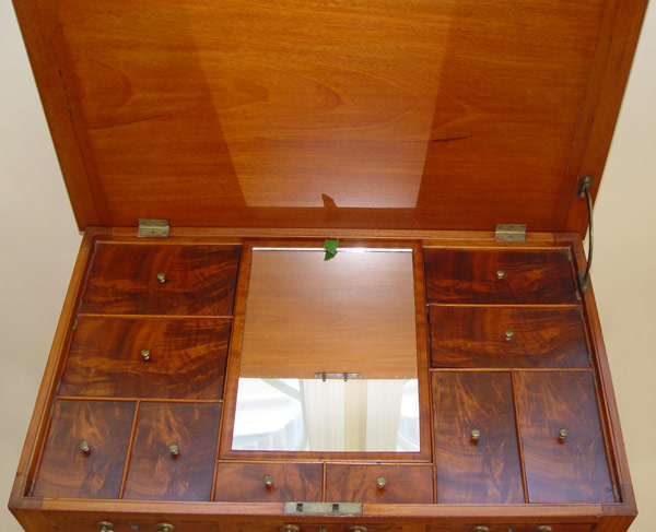 FEDERAL PERIOD FLAME BIRCH DRESSING STAND: Fine quality craftsmanship with detailed fitted interior. Lift top exposes tiger birch faced compartments and drawers. At the center is an adjustable mirror. The exterior with string inlay and original bras hardware. Fine tapered legs. Please note 2 shrinkage lines on desk surface. 33'' tall x 32'' x 20''.