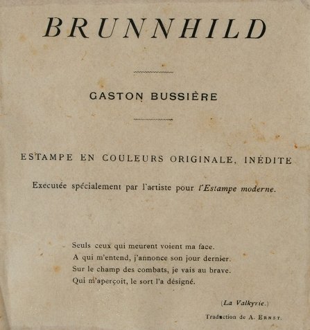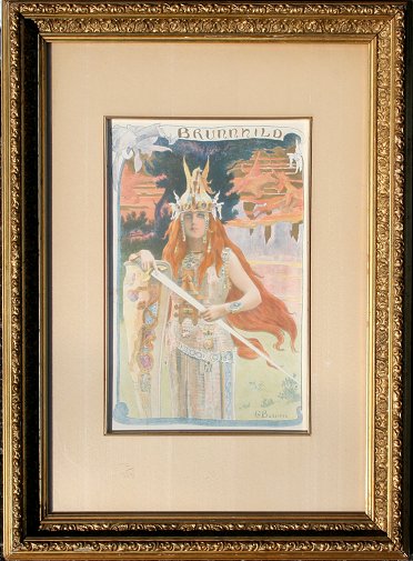 BUSSIERE, Gaston, (French, 1862-1929): ''Brunnhild'', Nouveau Lithograph, 14'' x 9'', carved and gilded frame, 25'' x 18 1/2''.