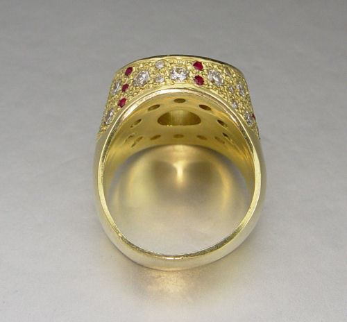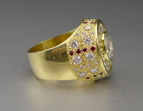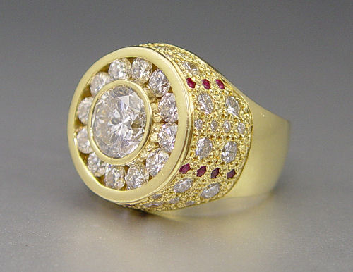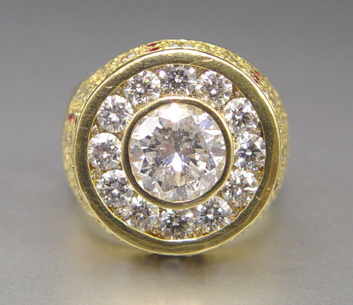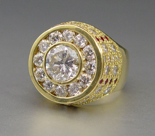 WOW! 7.83 CTW DIAMOND GENTS RING WITH 3.48 CT CENTER: Custom made 18k yellow gold ring centered by a bezel set 3.48 ct brilliant cut diamond, H-I color and I1 clarity, surrounded by a row of 12 channel set round brilliant diamonds, total approx. 2.04 ct. color H-I , clarity VS2 - SI1. Bead set under these twelve are 24 round full cut diamonds, combined weight of .24 Ct, color H-I, clarity VS2-SI1. The side of the domed top have a beaded motif that is pave set with 36 diamonds, approx. 2.07 Ctw, and 18 round mixed cut ruby melee. Ruby combined weight is approx. .5 Ct. Estimated total diamond weight for this spectacular ring is 7.83 carats. Size 11. Weight 42.3 grams. Sold with a current appraisal from Schuler Gemological Service's GIA graduate gemologist for $29,585.