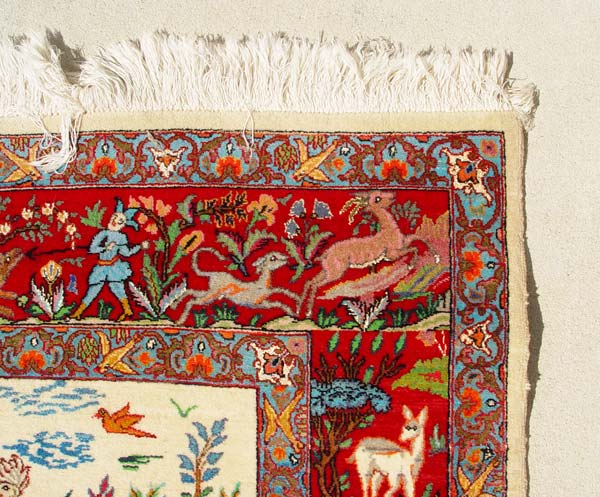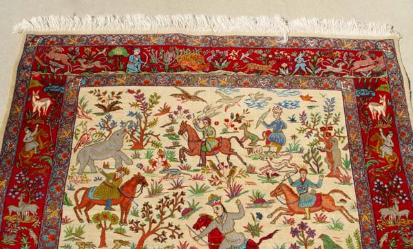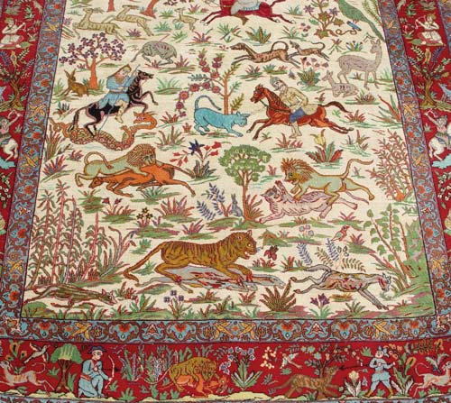HAND TIED FINE PERSIAN TABRIZ HUNT SCENE CARPET: With figures, horses, animals and hunt scenes. Approx. 6' 10 1/2'' x 4' 11''