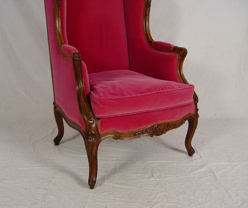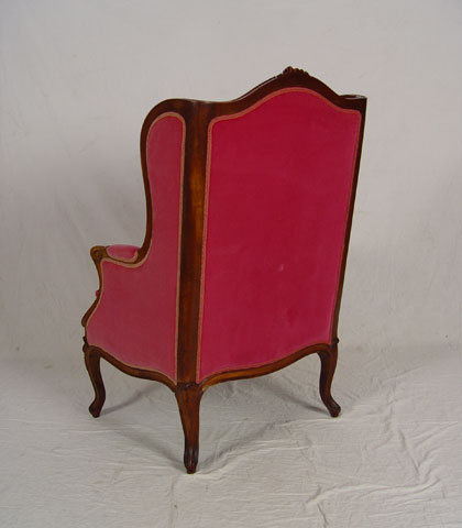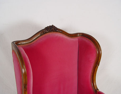 CARVED FRENCH STYLE MAGENTA VELVET WING CHAIR: Carved walnut frame upholstered in rich magenta. 44'' tall x 31'' deep x 28 1/2'' wide.