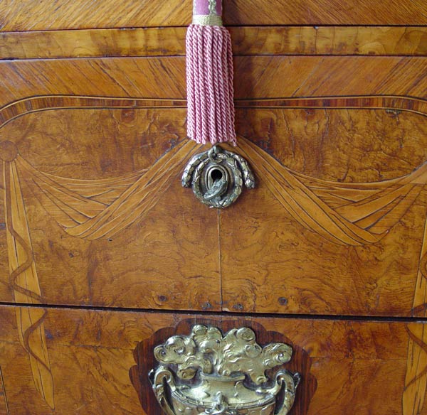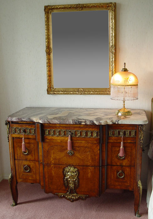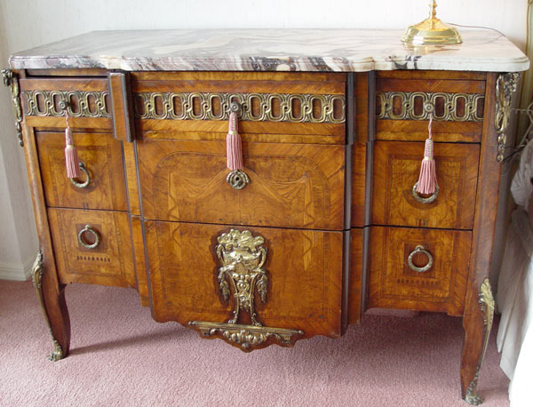 TURN OF THE CENTURY FRENCH BLOCK FRONT CHEST: Swirled and shaped marble top over a chest of elaborate veneer with feather edge and swag design. 3 drawers with band of ormolu over 2 very deep drawers. Brass rams head masquerons. Note a 3'' piece of veneer loss at the base. 51'' wide x 36 1/2'' x 23 1/2''.