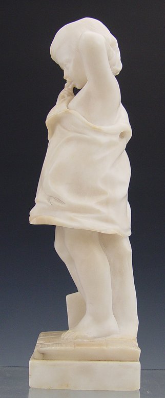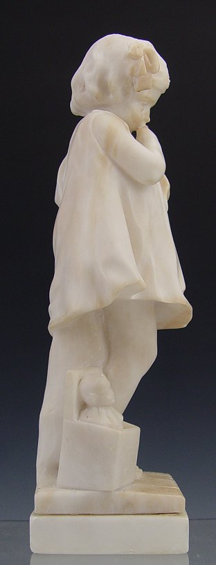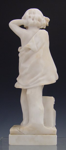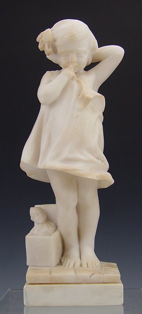 CARVED ALABASTER SCULPTURE OF LITTLE GIRL WITH JACK-IN-THE-BOX: 11 1/2'' h., no visible signature, repair to base.