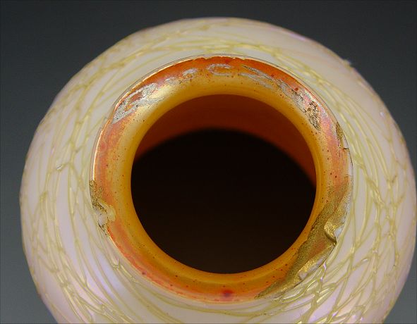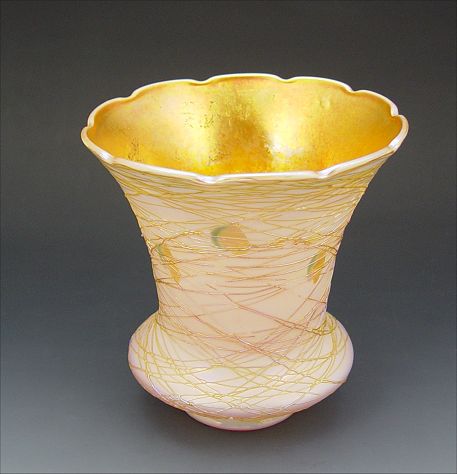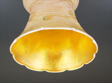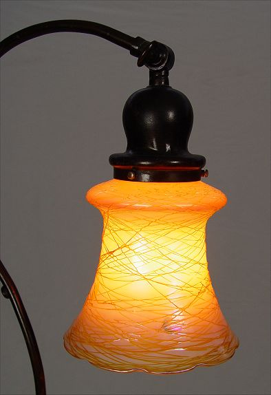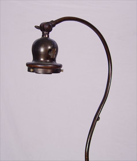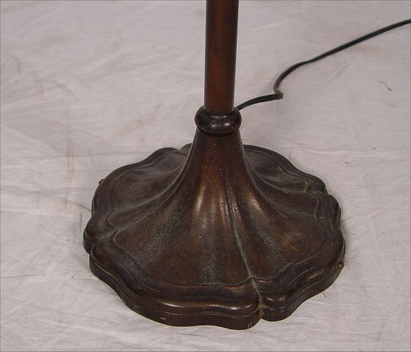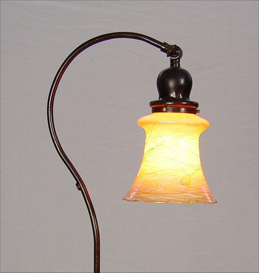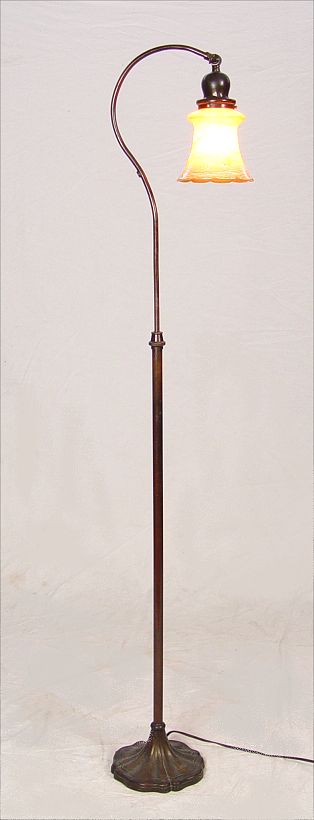 HANDEL FLOOR LAMP: Adjustable angle of shade. Original patina with wear to the finish on the base. Sold with the signed Quezal threaded art glass shade (chips on the fitter rim). 54'' tall.