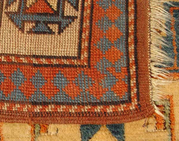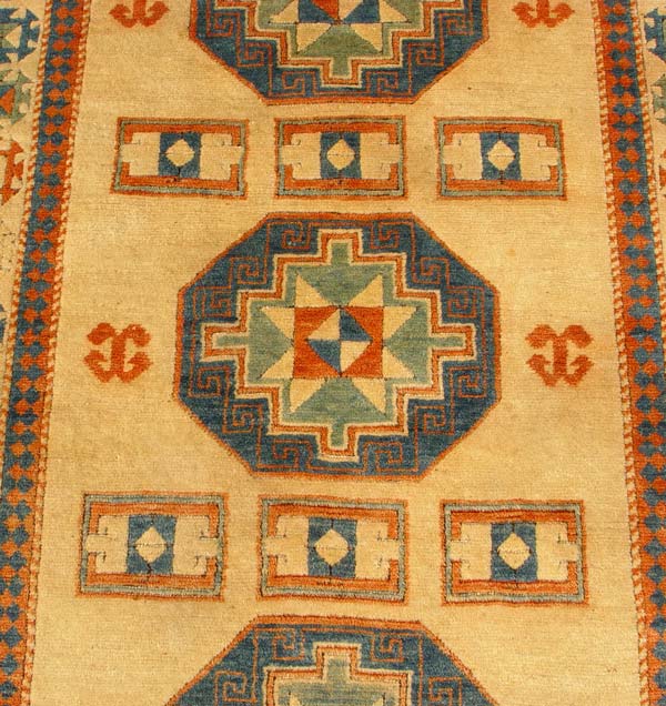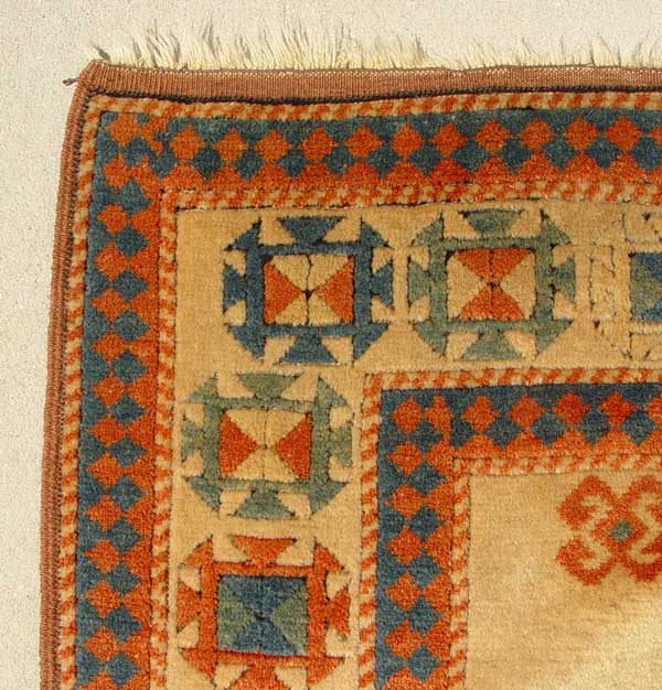 TURKISH KAZAK CARPET: Approx. 4'4'' x 7'. Brown field with bold geometric design.