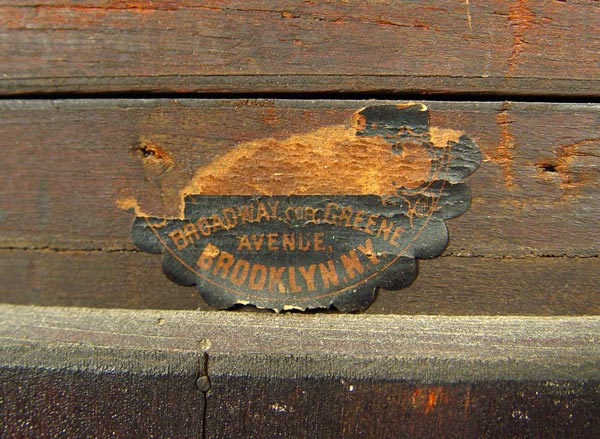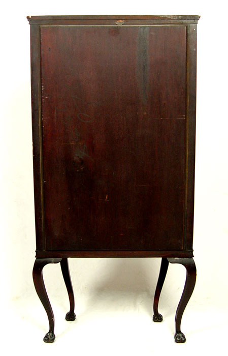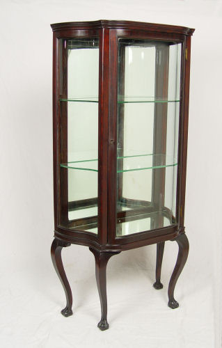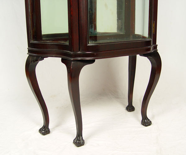 LATE VICTORIAN MAHOGANY DISPLAY CABINET: French style with slightly curved glass front and sides. Interior with mirror back and two glass shelves. Cabriole legs, carved paw feet. Remnants of Brooklyn New York label. 58 1/2'' tall x 28 1/2'' wide x 14 1/2'' deep.