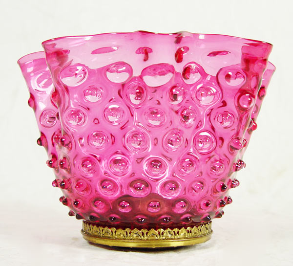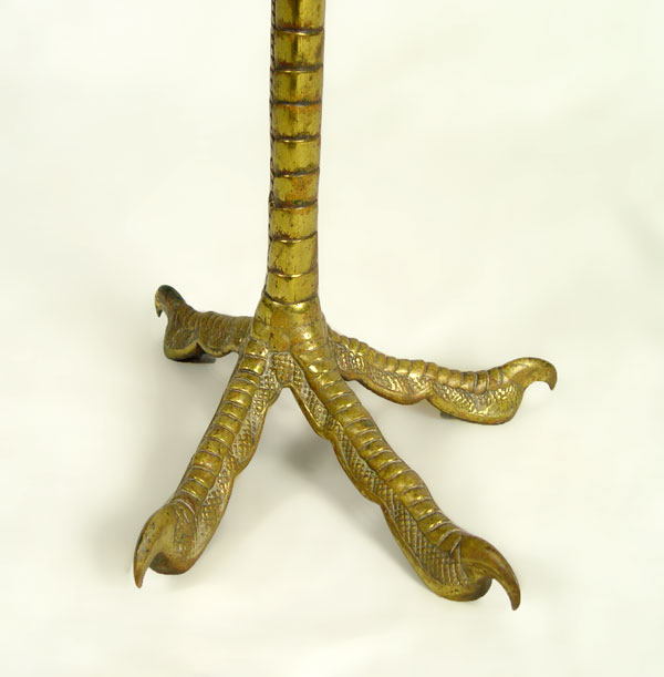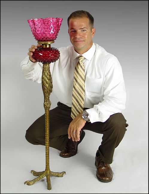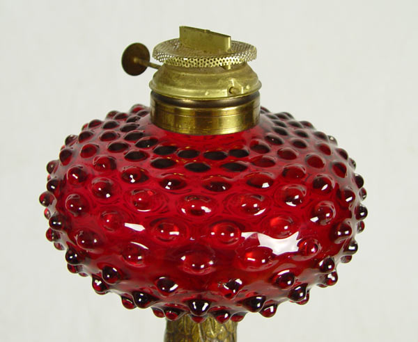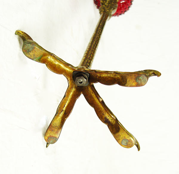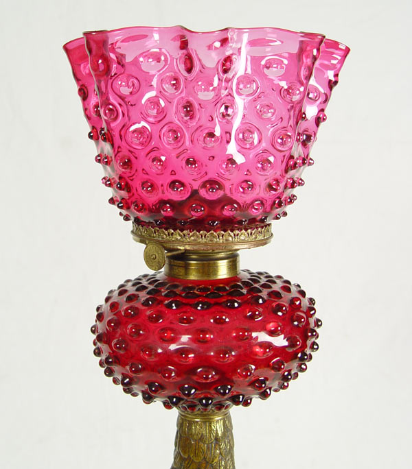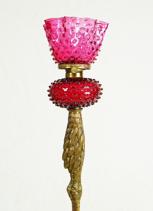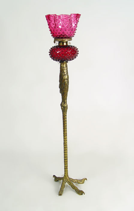 VICTORIAN LIFE SIZE OSTRICH LEG OIL LAMP: 43'' tall overall. Cranberry hobnail glass font and shade. The thumbwheel is marked Made in US of America.