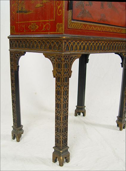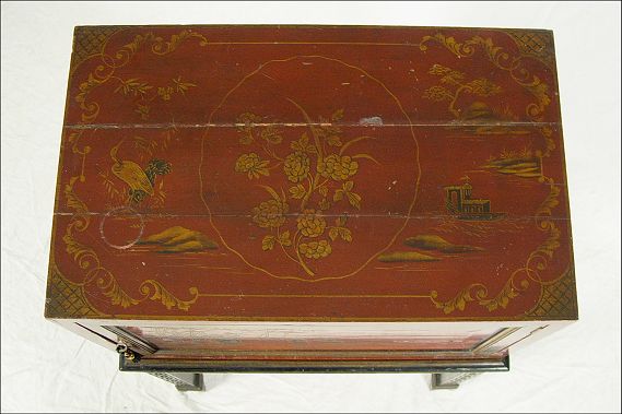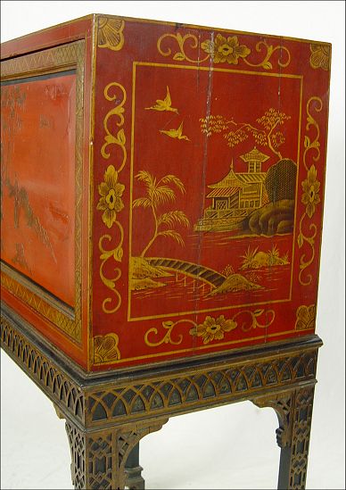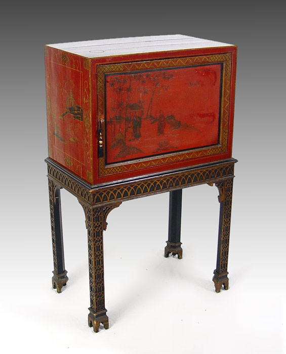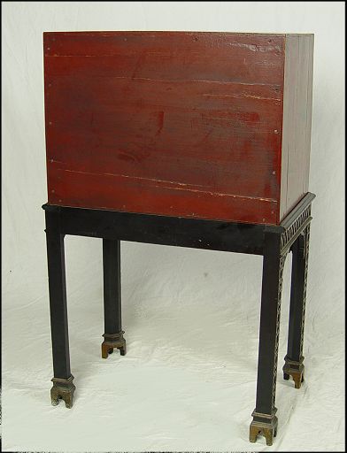 CHINESE RED LACQUER CHEST ON STAND: Single door chest decorated with gold painted figures, single interior shelf. Custom fit to Chinese Chippendale carved stand. 41'' tall x 26''w. x 16'' deep. Please note splits to top.