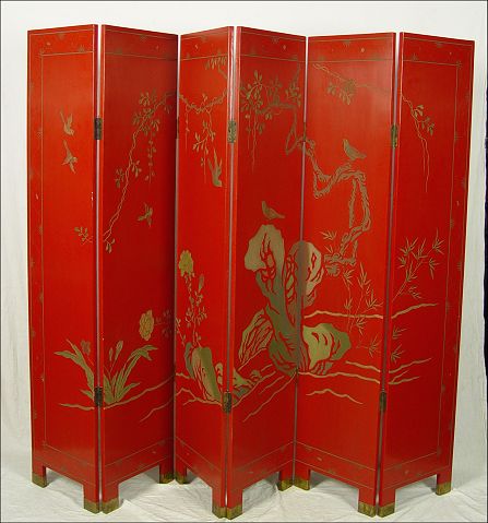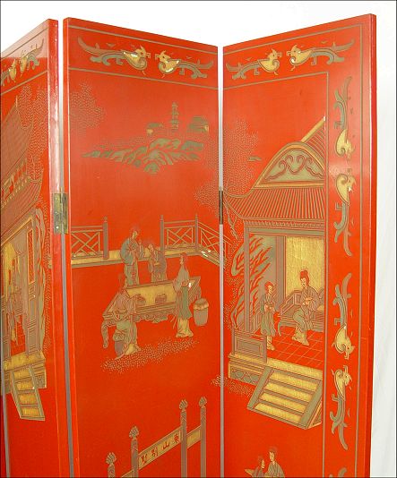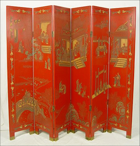 CHINESE RED LACQUER 6 PANEL FOLDING SCREEN: Both sides carved, birds and landscape to one and figures and architectural details, brass caps to feet, 6'tall, 16'' panels, approx. 96'' wide overall.