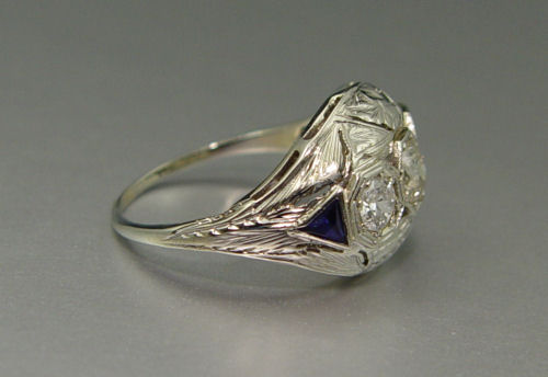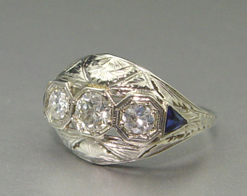 3 STONE DIAMOND AND SAPPHIRE DOME RING: 20k white gold ring set with three diamonds, approx. .75 Ctw., accented with two sapphires and an etched design. First diamond is old mine cut measuring approx. 3.60 x 1.67mm, next diamond is old Euro round cut measuring approx. 3.75 x 2.06mm, and the third diamond is a round transitional cut measuring approx. 4.75 x 2.76mm. They average SI-I1 clarity and H-I-J in color. Accented by two triangle shaped calibre cut synthetic sapphires, one has a small chip. 3.2 grams, size 7.
