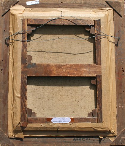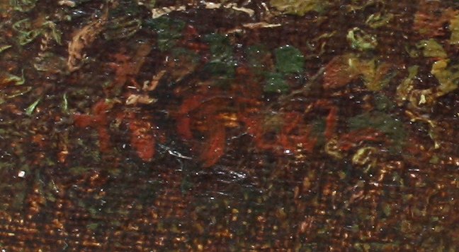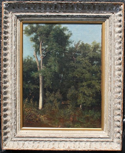 LUSH FOREST LANDSCAPE IN THE STYLE OF BARBIZON SCHOOL: OIL/Canvas, 15 1/2'' x 12 1/2'', painted gesso frame with wear and missing gesso, 20 1/2'' x 17 1/2''.
