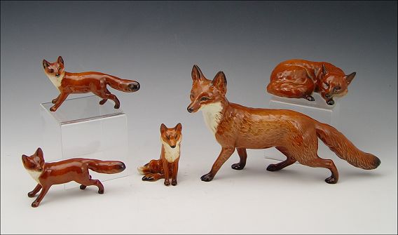 5 PIECE GROUP OF BESWICK FIGURES OF A FOX: Crouching, standing and sitting. The largest is 5''h. x 9 1/2'' long. The smallest 2 1/2'' tall x 4'' long.