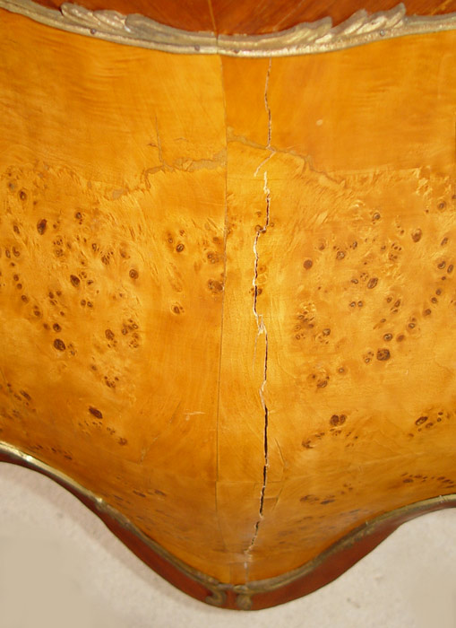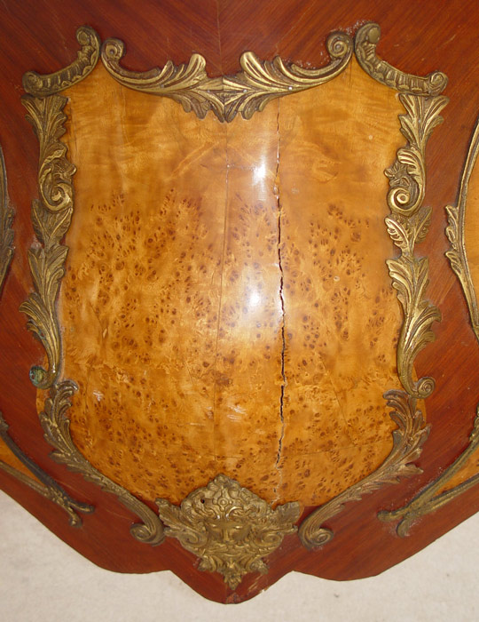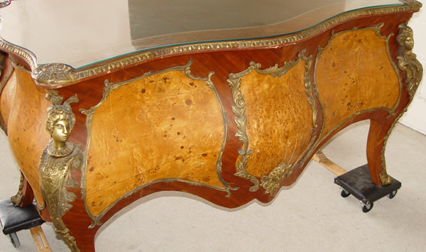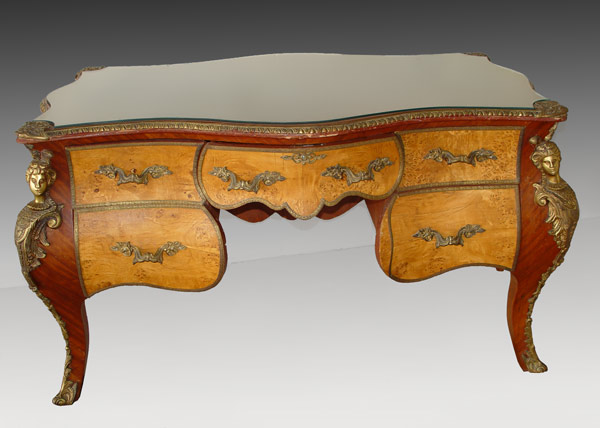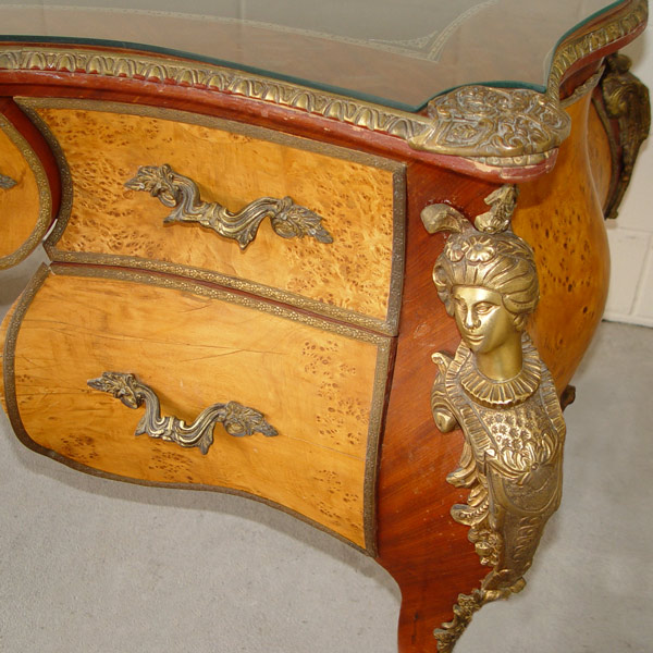 20th C FRENCH STYLE BUREAU PLAT DESK: Bombay form with figural ormolu at the corners, embossed black leather top, burl wood panels. Protective glass top. Please note split to front section.