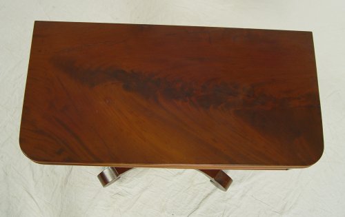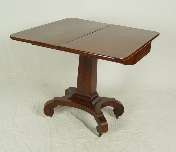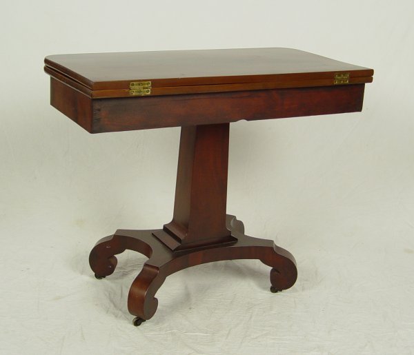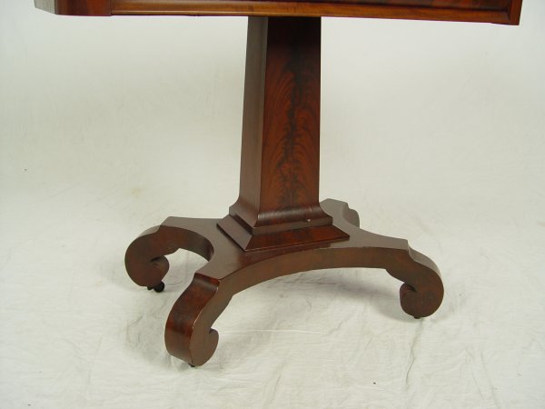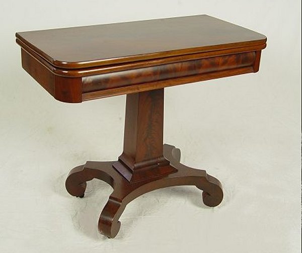 AMERICAN EMPIRE CROTCH GRAIN MAHOGANY GAME TABLE: Pedestal base, scroll feet. Measures 29 1/2'' h. x 36'' x 17 1/2''