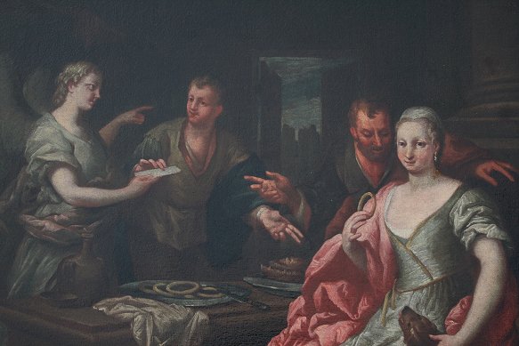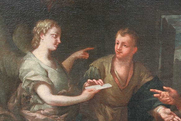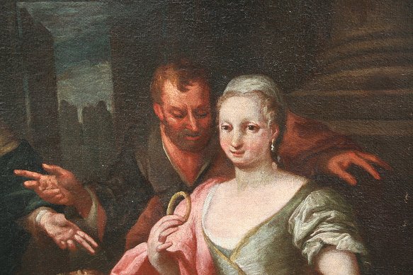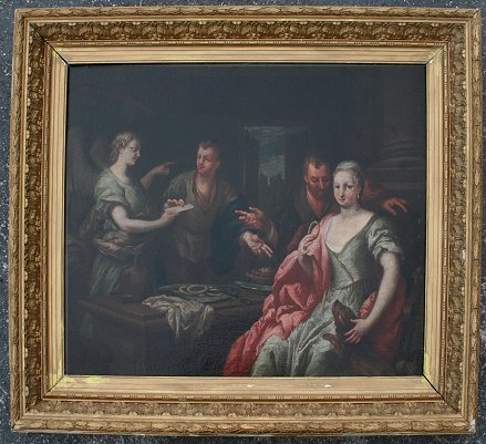 ALLEGORY OF FIDELITY AFTER GAMBARINI: Early Oil/Canvas, 24 1/8'' x 31'', no visible signature, encased in gilded acanthus leaf motif frame with overpaint and missing gesso, 30'' x 37''.