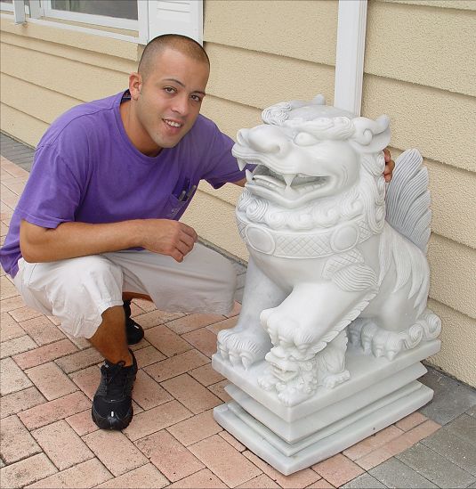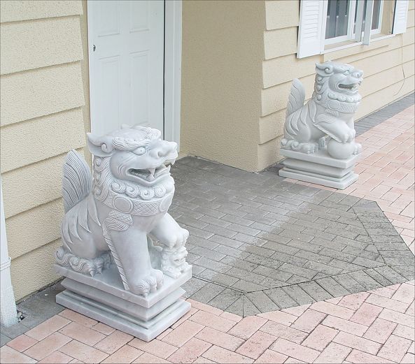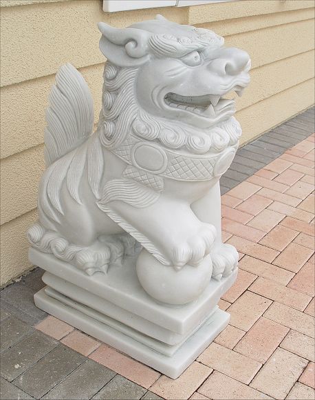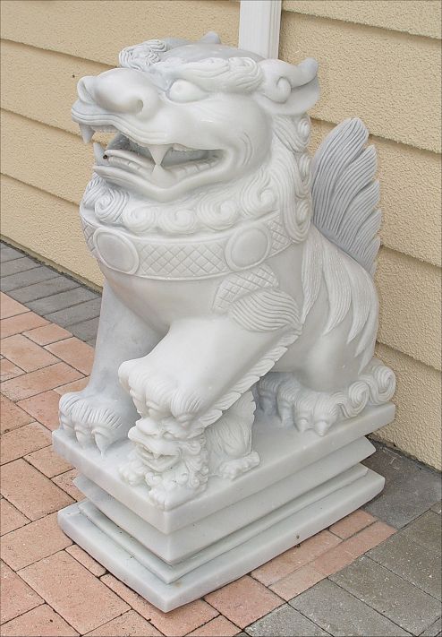 PAIR OF LARGE CARVED MARBLE FOO DOGS: Measures 34'' h x 132 3/4'' x 22''
