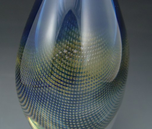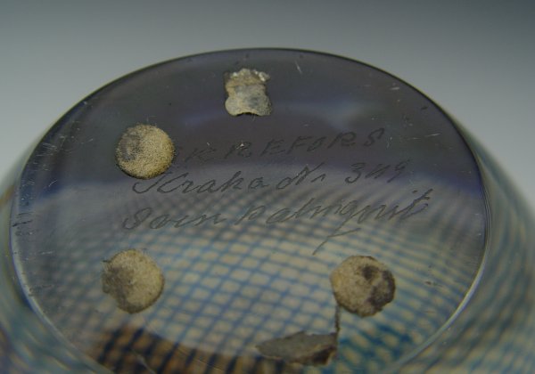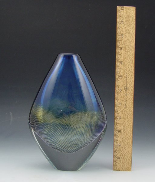 SVEN PALMQUIST ORREFORS KRAKA ART GLASS VASE: Blue netting and bubbles encased in clear. Engraved Orrefors Kraka No. 349 Sven Palmquist''. 8 1/2'' tall.