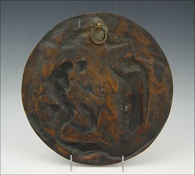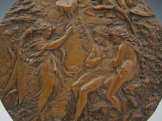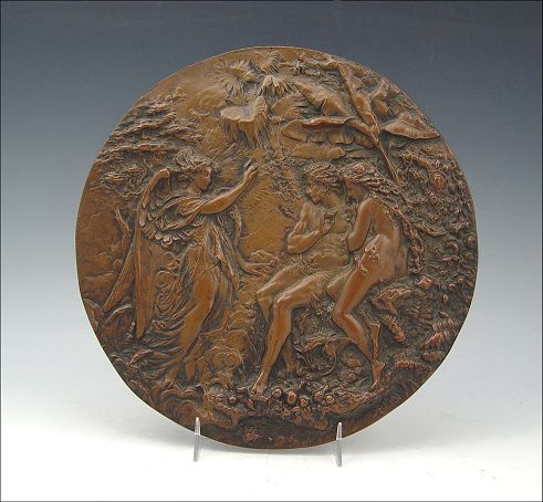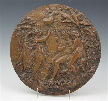 RELIGIOUS BRONZE PLAQUE - EXPULSION OF ADAM AND EVE: Possibly to The Henry Bonnard Bronze Co. New York. 9 1/2'' dia.