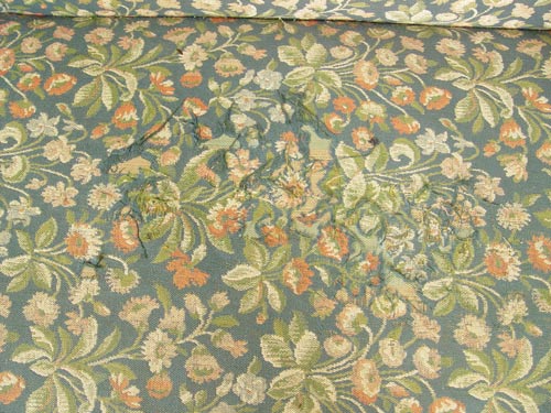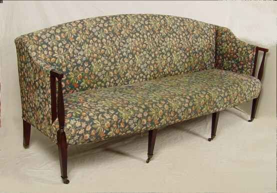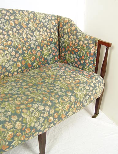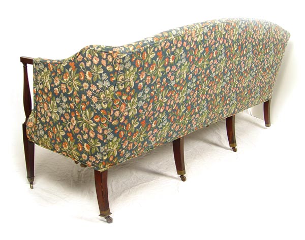 SHERATON STYLE MAHOGANY FRAME SOFA: Wood reeded front arm supports, 8 legs ending in brass capped castors, floral upholstery in worn condition. 36 1/2''h. x 82'' x 31''.