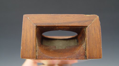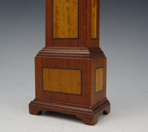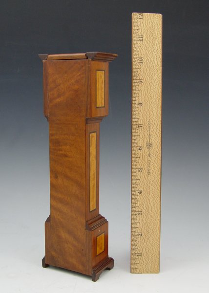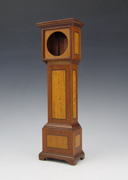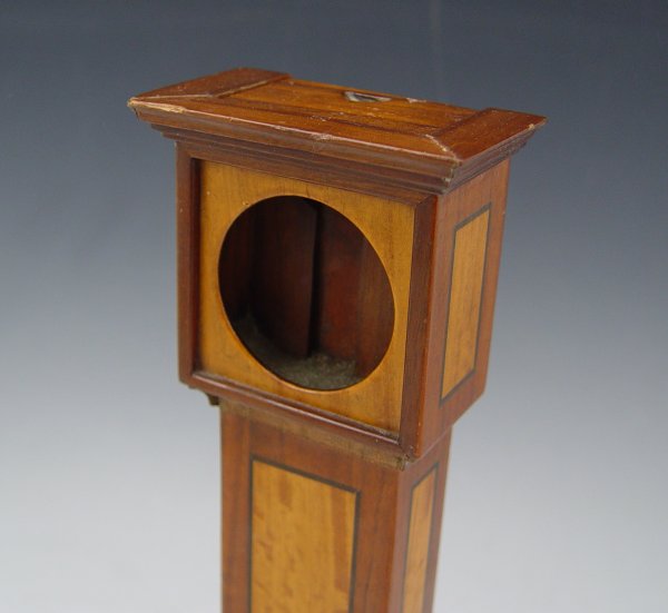 HANDMADE GRANDFATHER CLOCK FORM POCKET WATCH CASE: Inlaid wood veneers, top open to allow different pocket watches to place inside as face. 10 1/8'' h. x 3 1/2'' x 1 7/8''