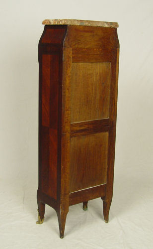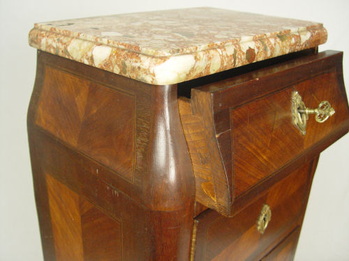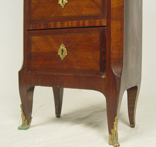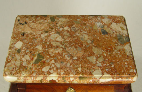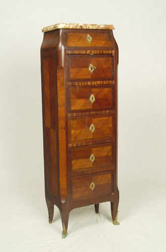 19th C FRENCH MARBLE TOP LINGERIE CHEST: Pink marble top over 6 lockable drawers embellished with fine brass escutcheons, brass ormolu on feet, feather grained veneer, 49''h. x 16'' x 10 1/2''.