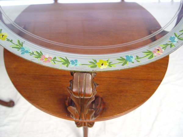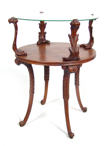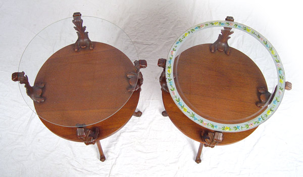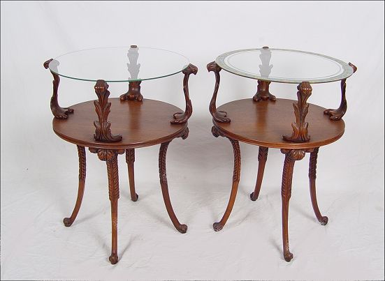 PAIR VINTAGE LEONARDO HOLLYWOOD REGENCY MAHOGANY SIDE TABLES: Two tier glass top tables. Metal Leonardo tag. 28''h. x 20'' dia.