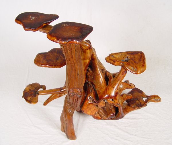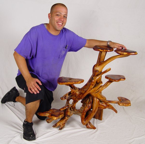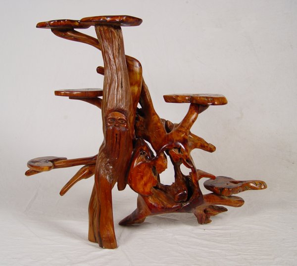NATURAL ROOT 6 ARM PLANT STAND: Varnished branch with wood spirit plant stand, natural shaped wood shelves, 34''h. x 41''w. x 13''.
