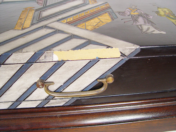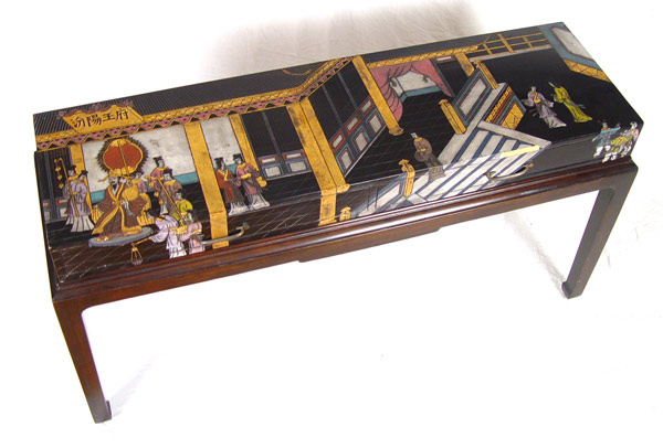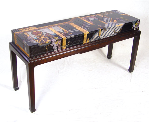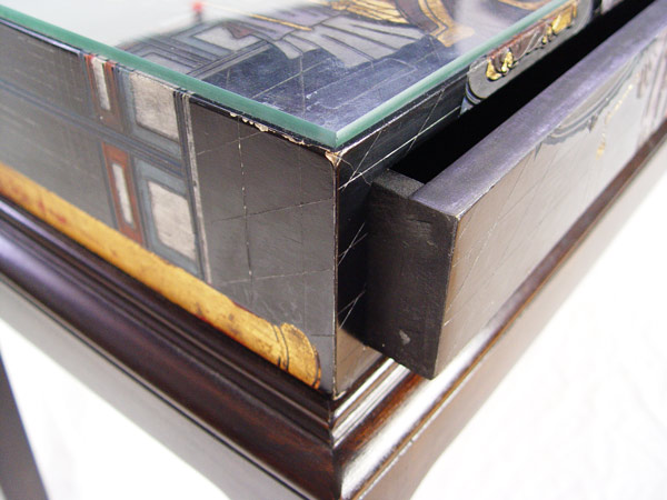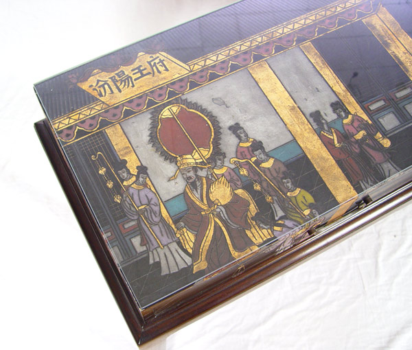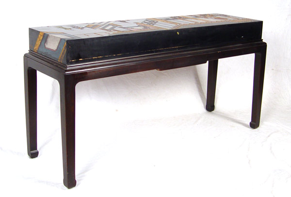 CONTEMPORARY CHINESE TWO DRAWER TABLE ON STAND: Long polychrome and gilt relief carved table of 2 drawers on a dark wood base. Protective glass top. 29''h. x 55''long x 18''.