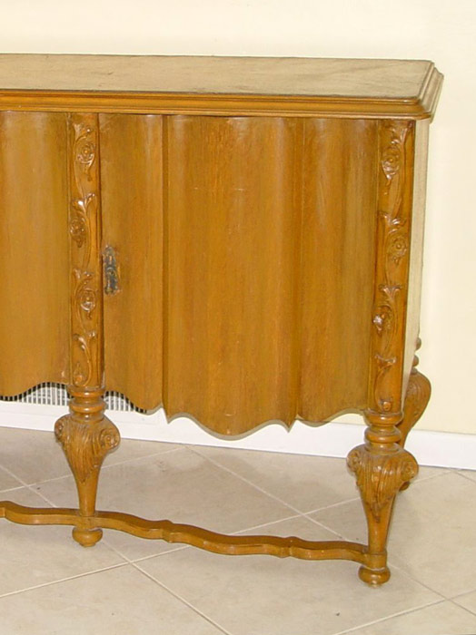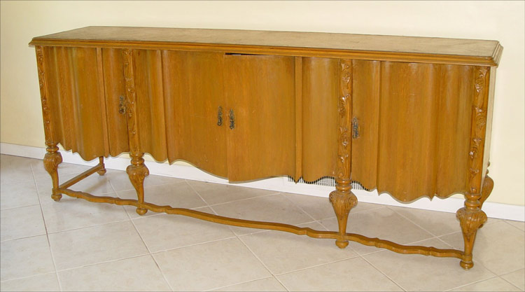 LARGE CONTINENTAL OAK SIDEBOARD: Great for conversion to kitchen cabinets. Curved front of four doors, raised on four legs, oak veneer. 39'' h x 97'' x 22''.
