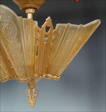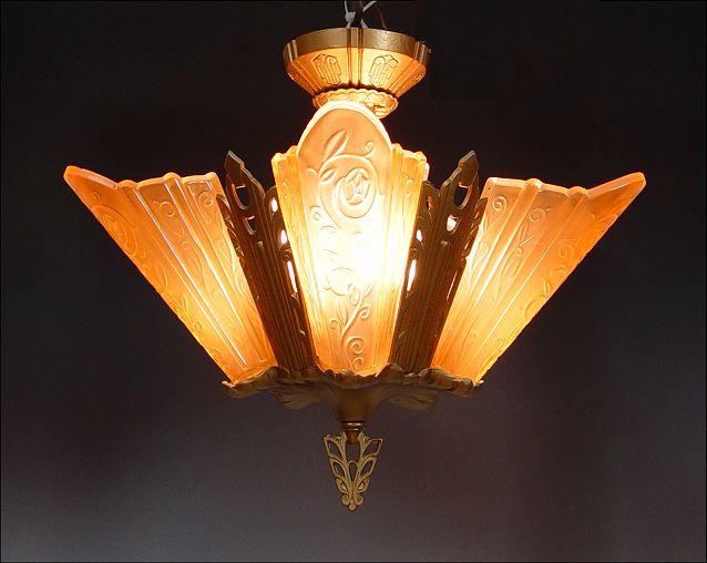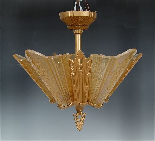 VINTAGE ART DECO CHANDELIER: 5 lights covered by 5 amber glass shades. Approx. 14'' tall, 19'' dia. Possibly Consolidated Glass. Sold with an extra matching shade.