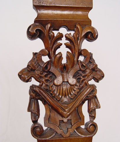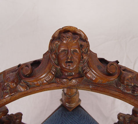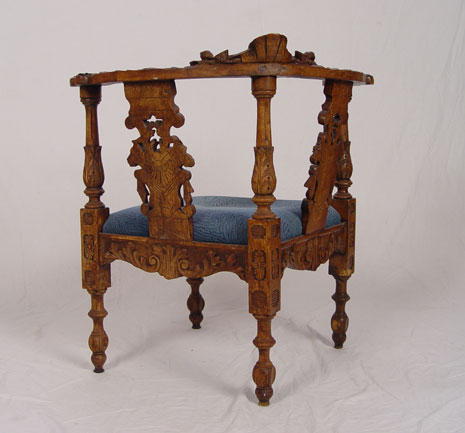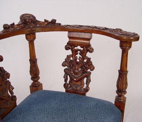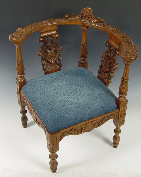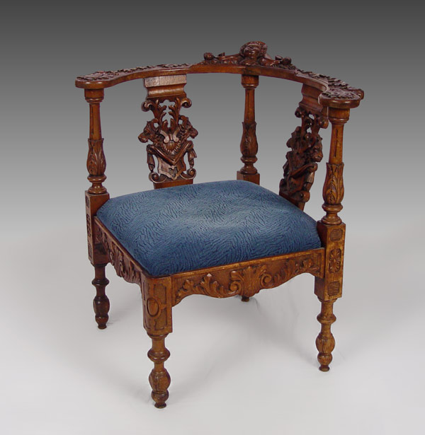 ORNATE 19TH C CARVED CORNER CHAIR: Profusely carved lions heads on the back supports, maiden head on the top rail. Measures 30'' h. x 28 1/2'' x 28''