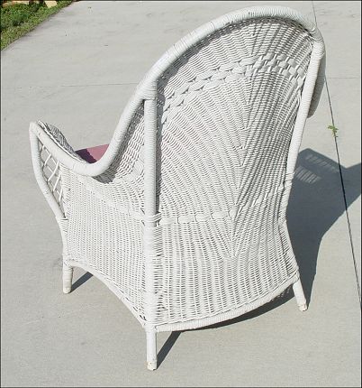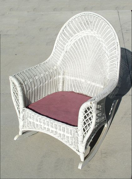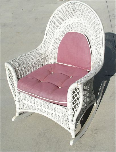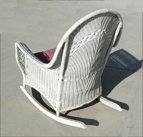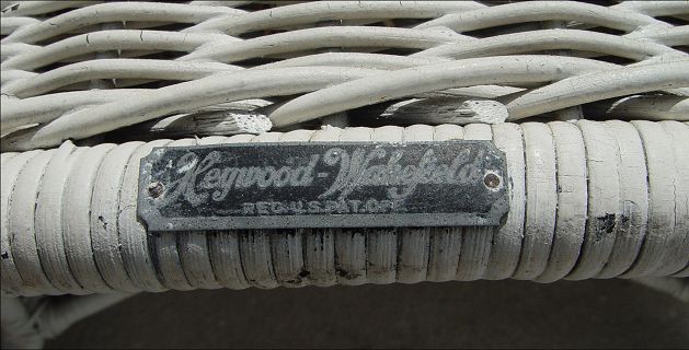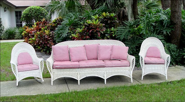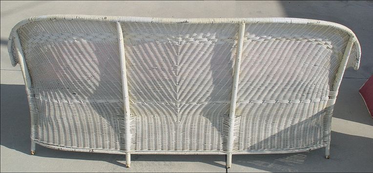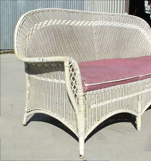 VINTAGE HEYWOOD WAKEFIELD 3 PIECE WICKER SET: Sofa, chair and rocking chair. The rocker has the metal Heywood tag. Sofa measures 38'' h x 82'' x 32''. Chairs approx. 39'' 30'' x 26''.