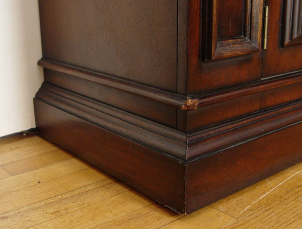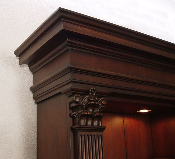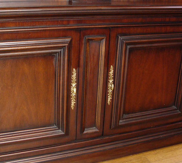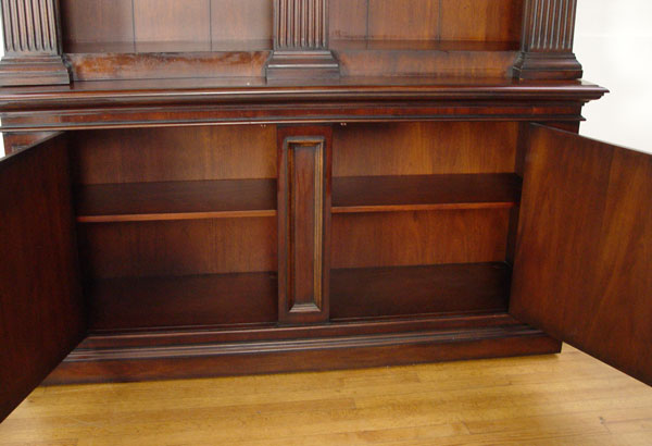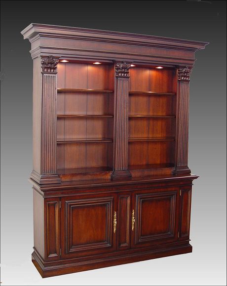 FINE CONTEMPORARY ILLUMINATED DISPLAY BOOKCASE / DISPLAY CABINET: Approx. 93 1/2'' tall x 75'' x 19''. 2 parts with upper being open display, shelves are glass framed in wood. Base cabinet with doors.