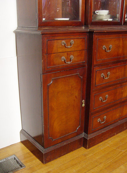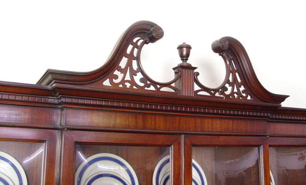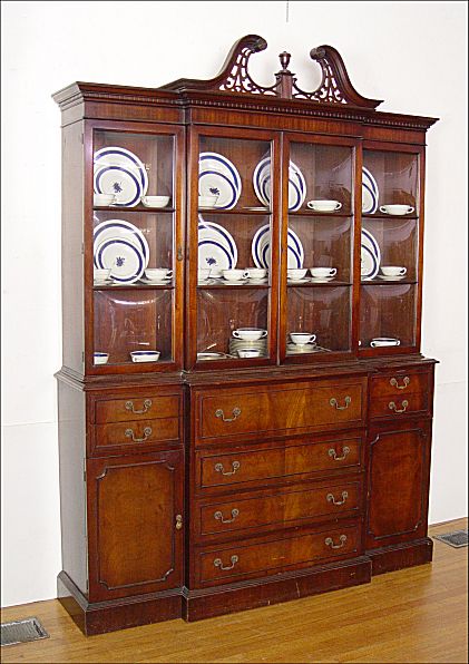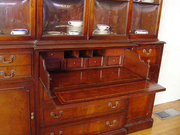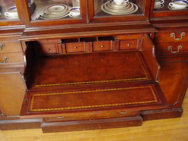 MAHOGANY SECRETARY BREAKFRONT CHINA CABINET: Center drawer falls to reveal the leather top writing surface and pigeon hole drawers. Bubble glass front. 90 1/2'' h. x 66'' x 16''