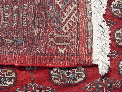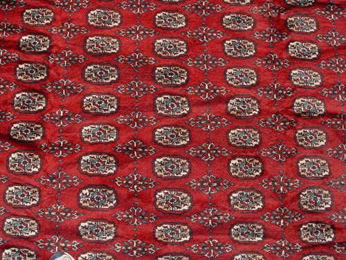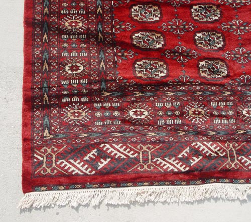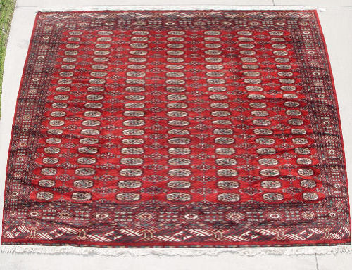HAND TIED BOKHARA RUG: Approx. 10' 2'' x 8' 3'', deep red ground.