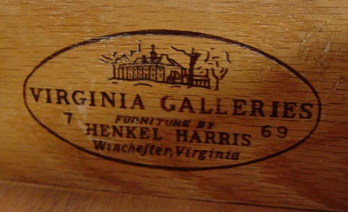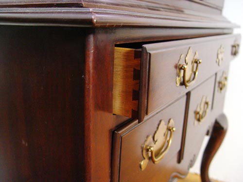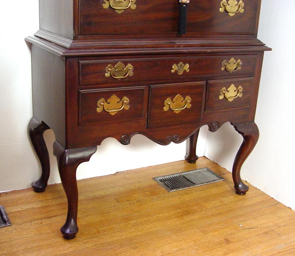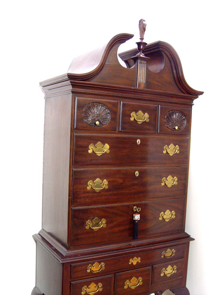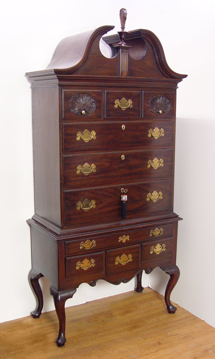 HENKEL HARRIS MAHOGANY HIGHBOY : Classic broken arch pediment with flame finial, 3 over 3 drawer top chest and one over three drawer bottom chest on cabriole legs, 90''h. x 41'' x 21''.