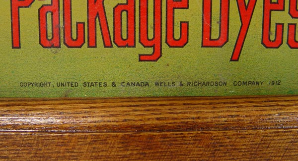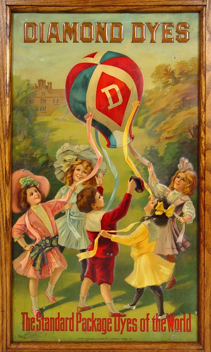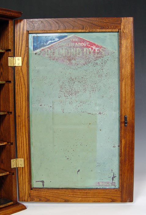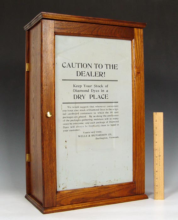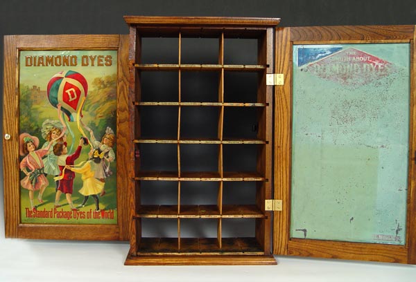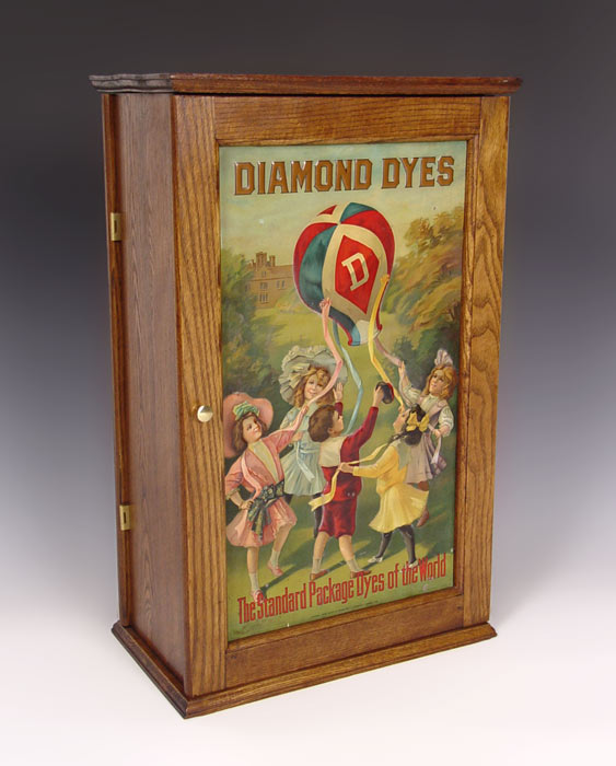 DIAMOND DYES TIN LITHO STORE CABINET: Children with balloon tin litho graphic on front and Caution to deal back. Both sides open for convenience. Measures 24 1/2'' h. x 15 1/4'' x 8 3/4''.