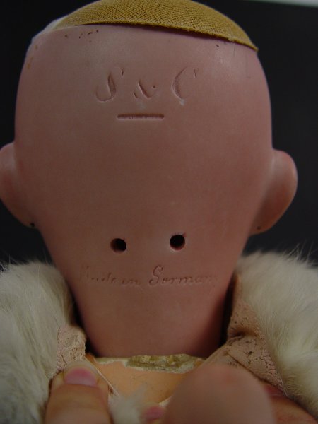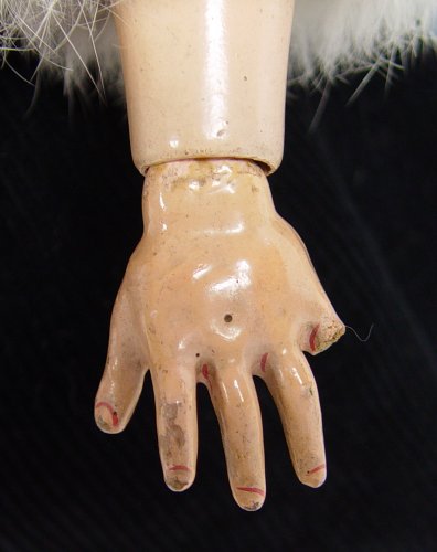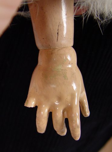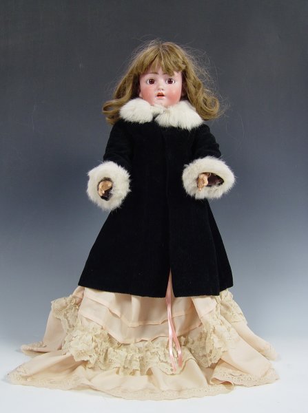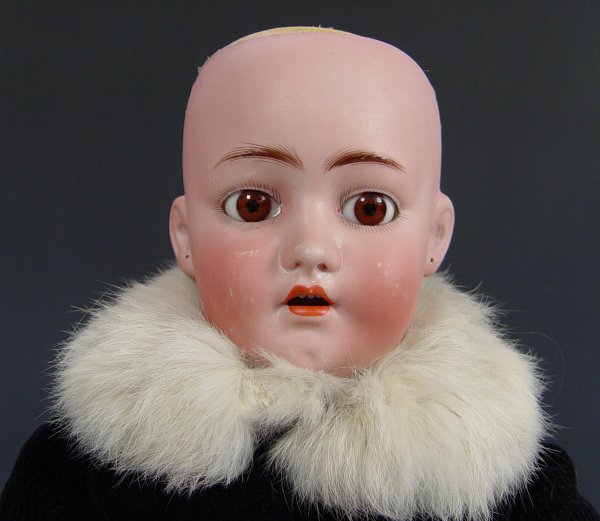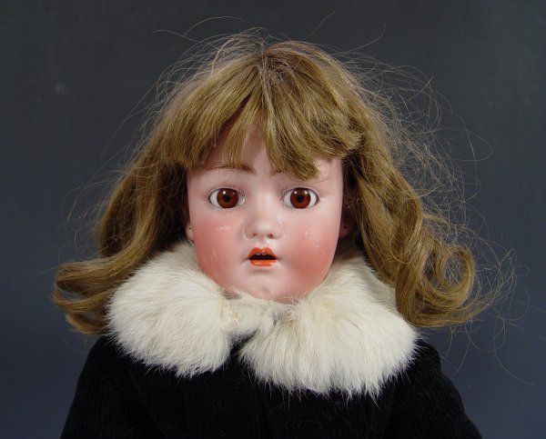 FRANZ SCHMIDT SIMON & HALBIG BISQUE HEAD DOLL: Open brown eyes, open mouth with teeth, rosy cheeks, pierced ears. Fully jointed body does show wear, loss of 2 fingers. The back of her head is marked S & C Germany. 24'' tall.