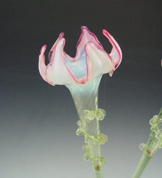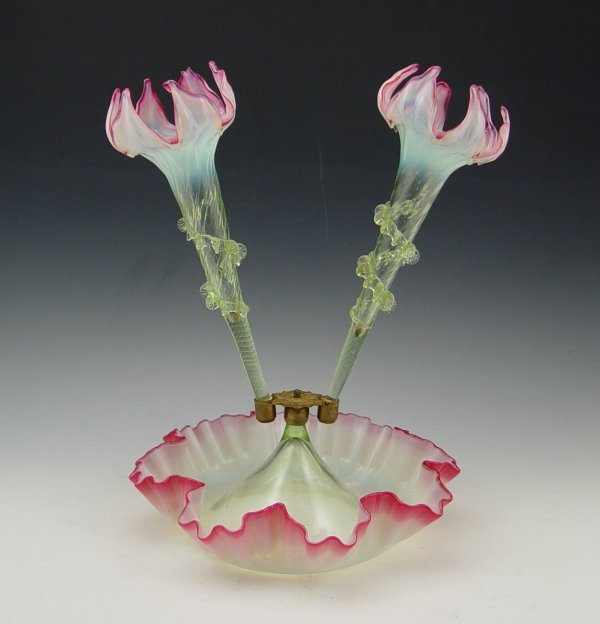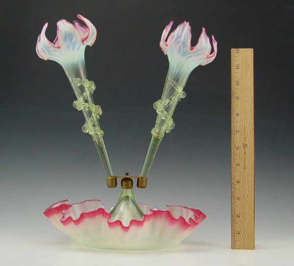 VICTORIAN ART GLASS EPERGNE: Two vase epergne, light Vaseline with opalescent and cranberry rim. The bowl is 9 1/2'' dia, 14'' tall overall.