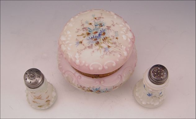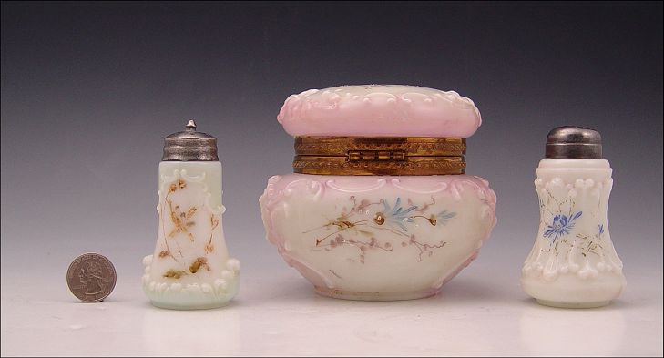 C.F. MONROE WAVECREST POWDER JAR AND SHAKERS: 1) Hinged top, hand painted dresser jar, signed with Wavecrest stamp, 4''h., 5'' dia. 2) Two good examples of shakers, 3 1/2''h., unsigned.